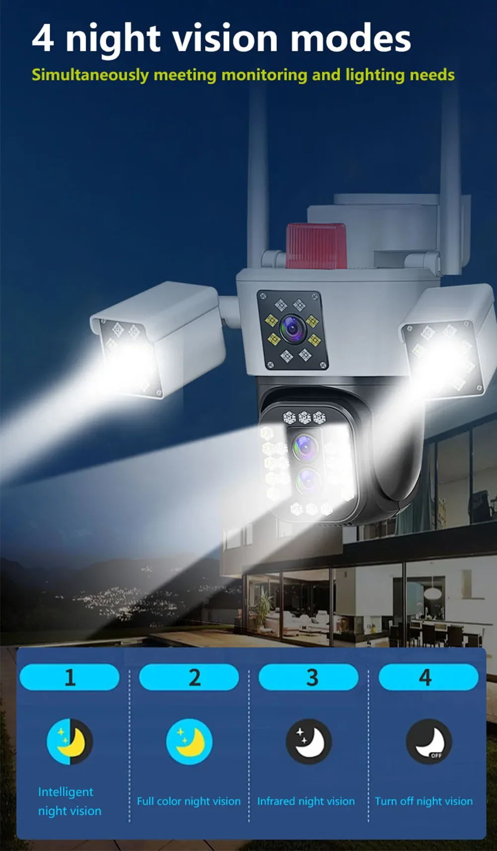* 3 image modes: smart mode/infrared mode/color mode, Infrared mode is infrared on mode. The image is black and white, the white LED is off Color mode: white LED lights up, day and night are color vision;