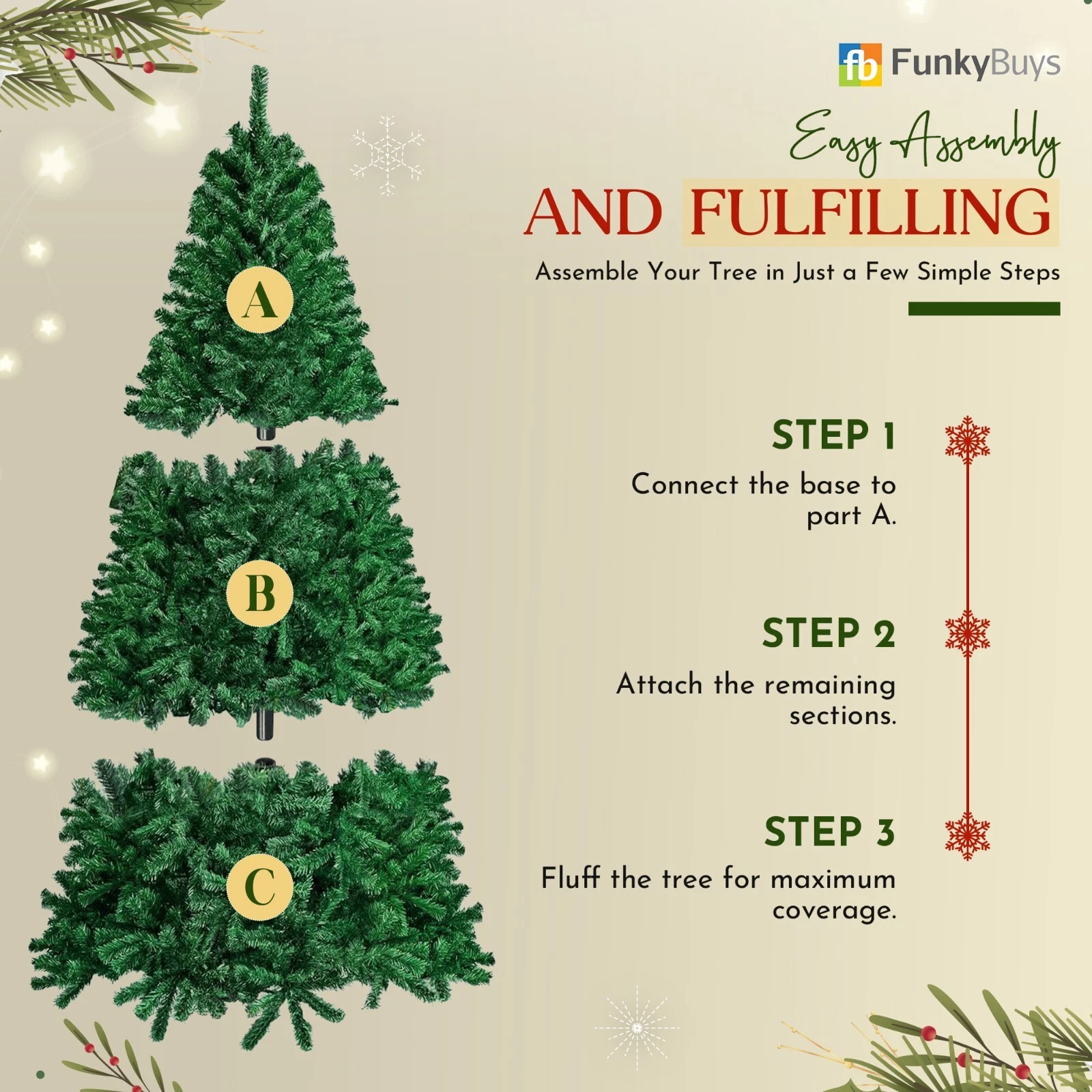 No more struggling with complex assembly! Our artificial Christmas tree features pre-attached branches and a sturdy metal stand, making setup a breeze. Just connect the sections, fluff the tips, and your tree is ready to sparkle.